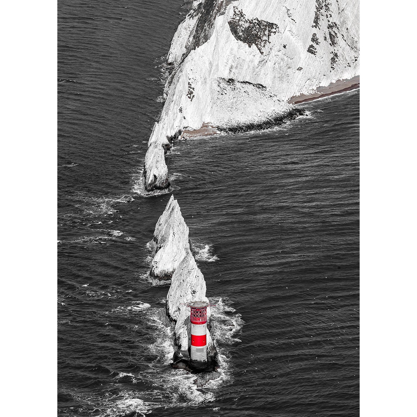 I decided to produce this image as black & white, leaving just the red bands of The Needles lighthouse in colour to add impact.